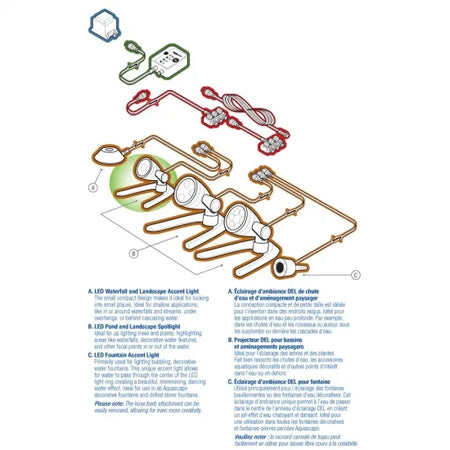 Aquascape LED lighting fixtures are extremely energy efficient, minimizing energy costs and providing a 90% savings over comparable halogen lighting. The fixture features a powerful LED diode equivalent to a 10-watt halogen light. The die-cast metal housing with a protective coating provides a durable finish that holds up in all weather conditions. Lights are permanently sealed and water tight, and they can be installed fully submerged in water or in traditional landscape settings.
