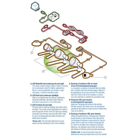 Aquascape LED lighting fixtures are extremely energy efficient, minimizing energy costs and providing a 90% savings over comparable halogen lighting. The fixture features three powerful LED diodes equivalent to a 20-watt halogen light. The die-cast metal housing with a protective coating provides a durable finish that holds up in all weather conditions. Lights are permanently sealed and water tight, and they can be installed fully submerged in water or in traditional landscape settings.