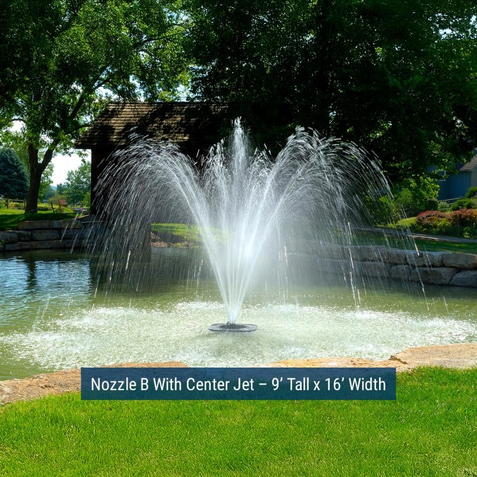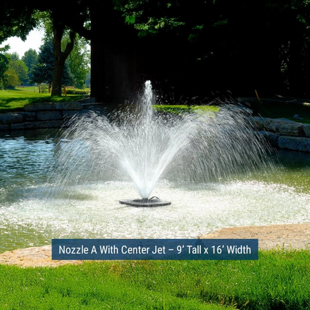 The CENTRIFUGAL PUMP DISPLAY FOUNTAIN boasts a distinctive center discharge pump design that keeps the submersible motor shaft and discharge in a vertical position. This design feature ensures that the entire weight of the fountain remains in the center of the float, making installation and removal from the float easy without requiring special mounting brackets or hardware. Additionally, our centrifugal pump generates high pressure, enabling impressive fountain heights and displays with significantly lower horsepower than other fountain equipment. However, this fountain should only be used for aesthetic purposes as the volume of water pumped into the air is insufficient to qualify as an aerating device according to Air-O-Lator’s standards for oxygen transfer testing.