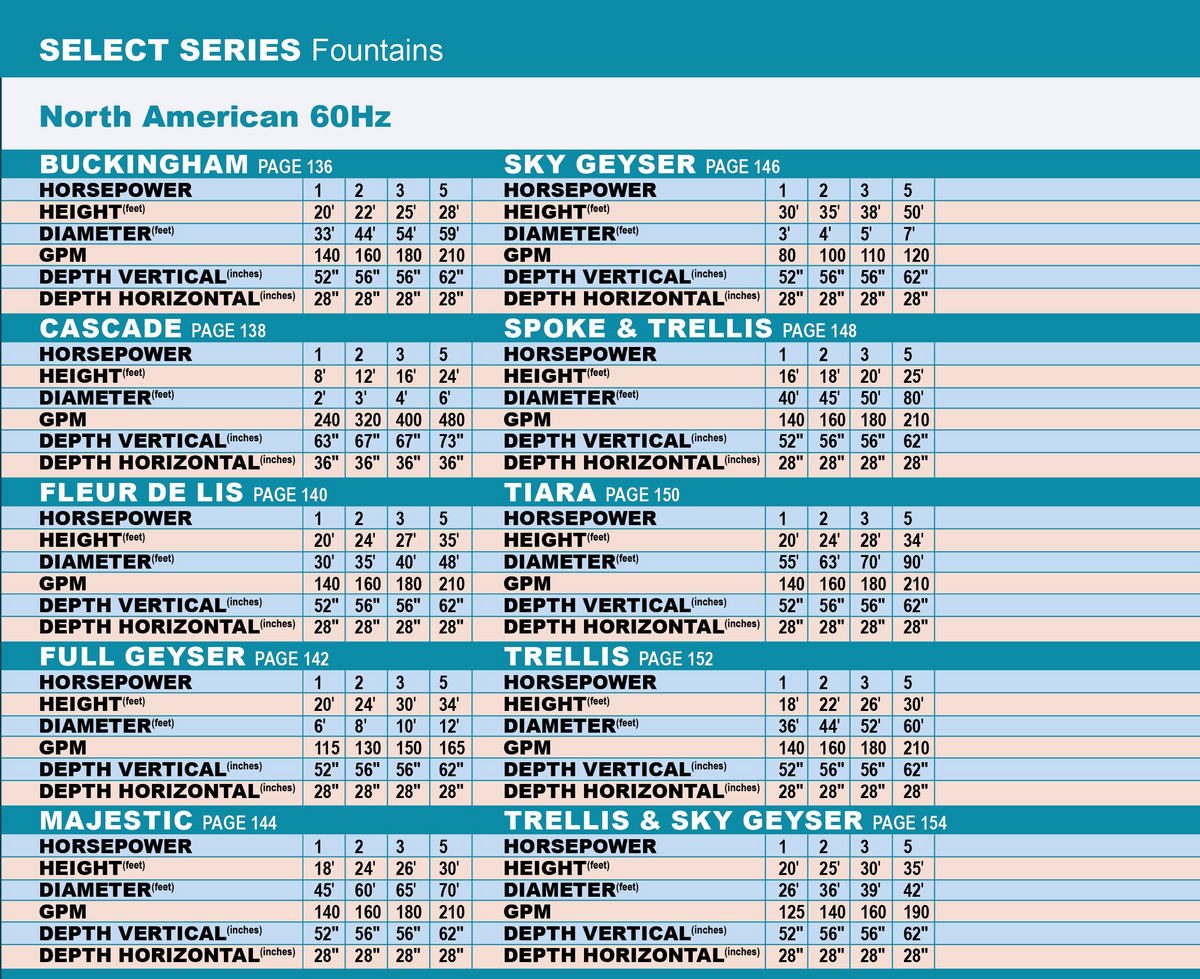 The Select Series Fountains are the cornerstone of the Aqua Control floating product offerings. This product line is built using centrifugal pumps (uses an impeller). These pumps are designed to produce high pressure, thus producing tall and wide spray patterns.