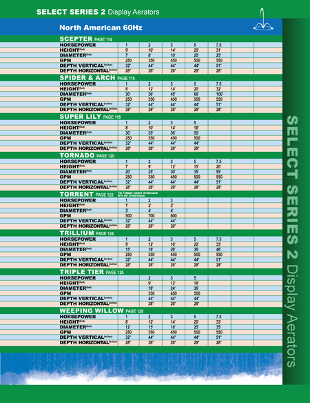 The Select Series 2 (SS2) brilliantly combines beauty and functionality with increased efficiency. These high performance aerators are re-engineered to minimize stress on the motor and increase performance. Composed of high strength composite materials, these innovative display aerators offer the highest spray patterns of their type in the industry.