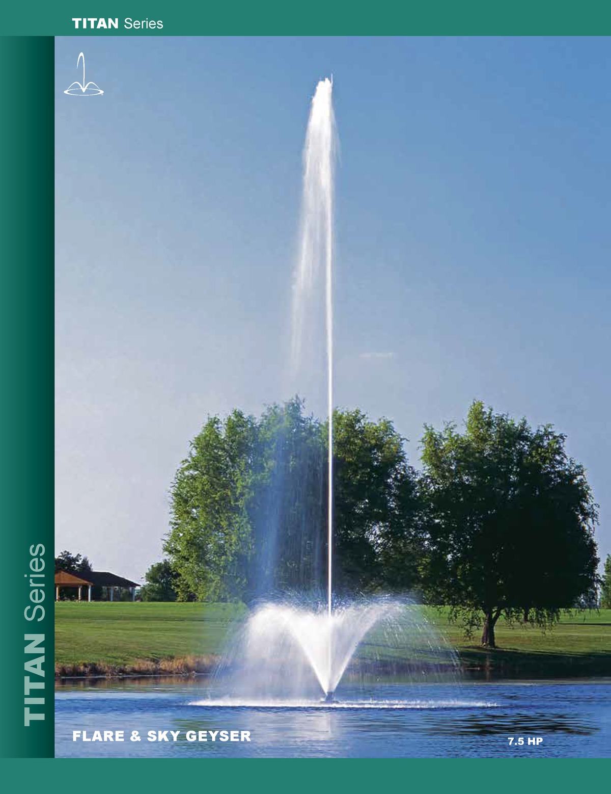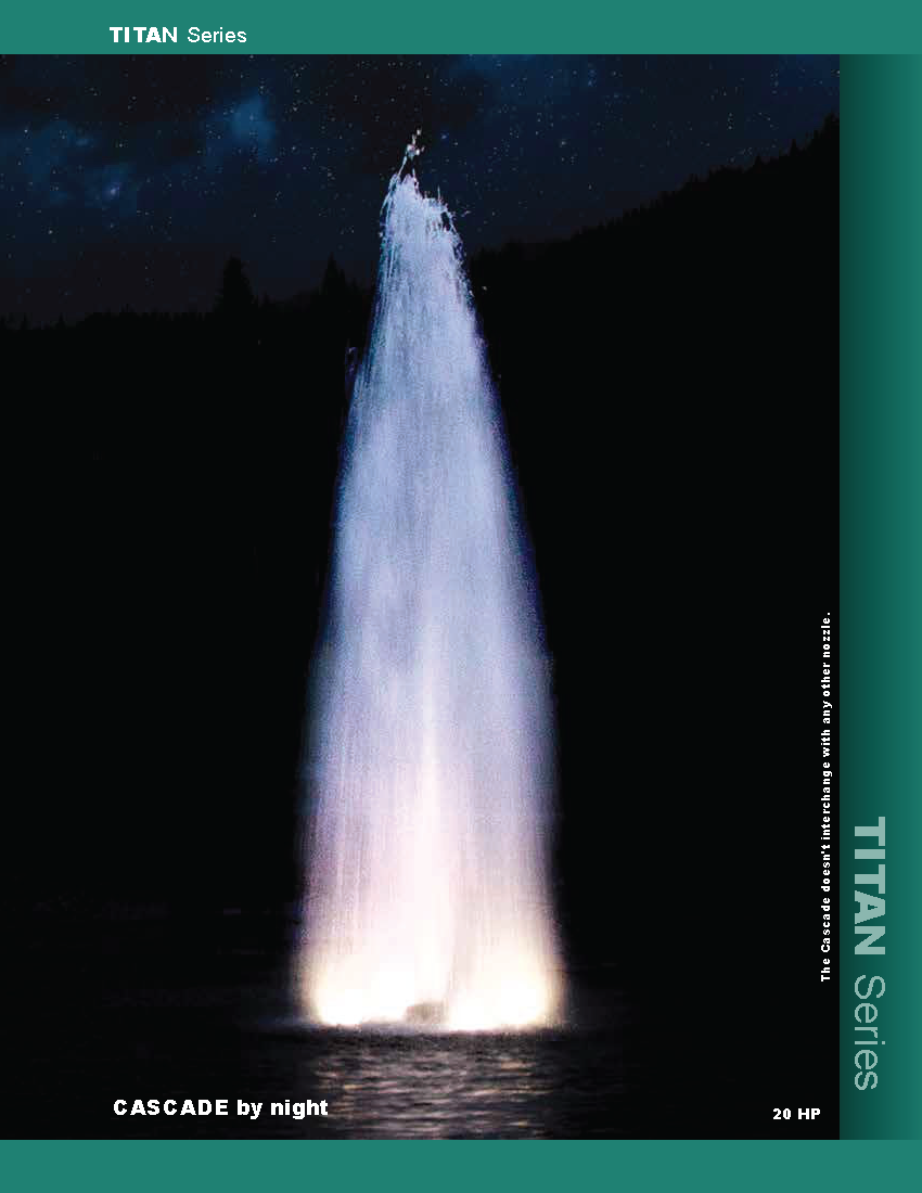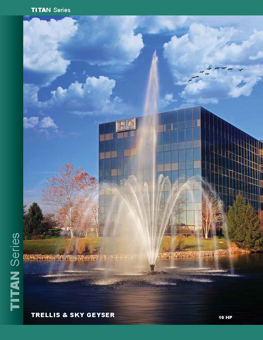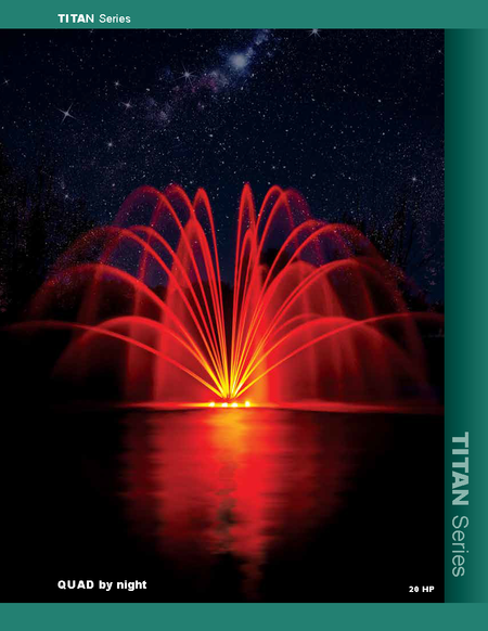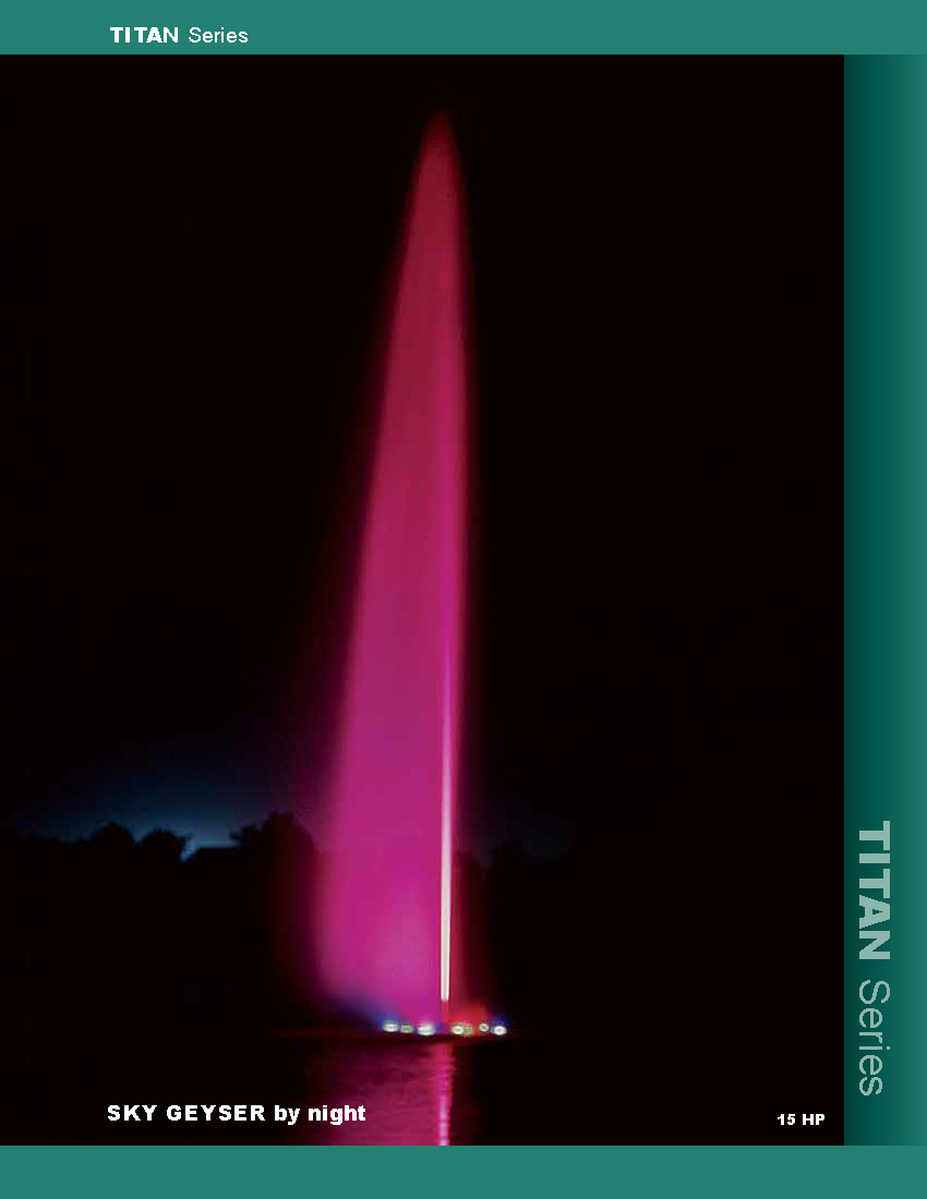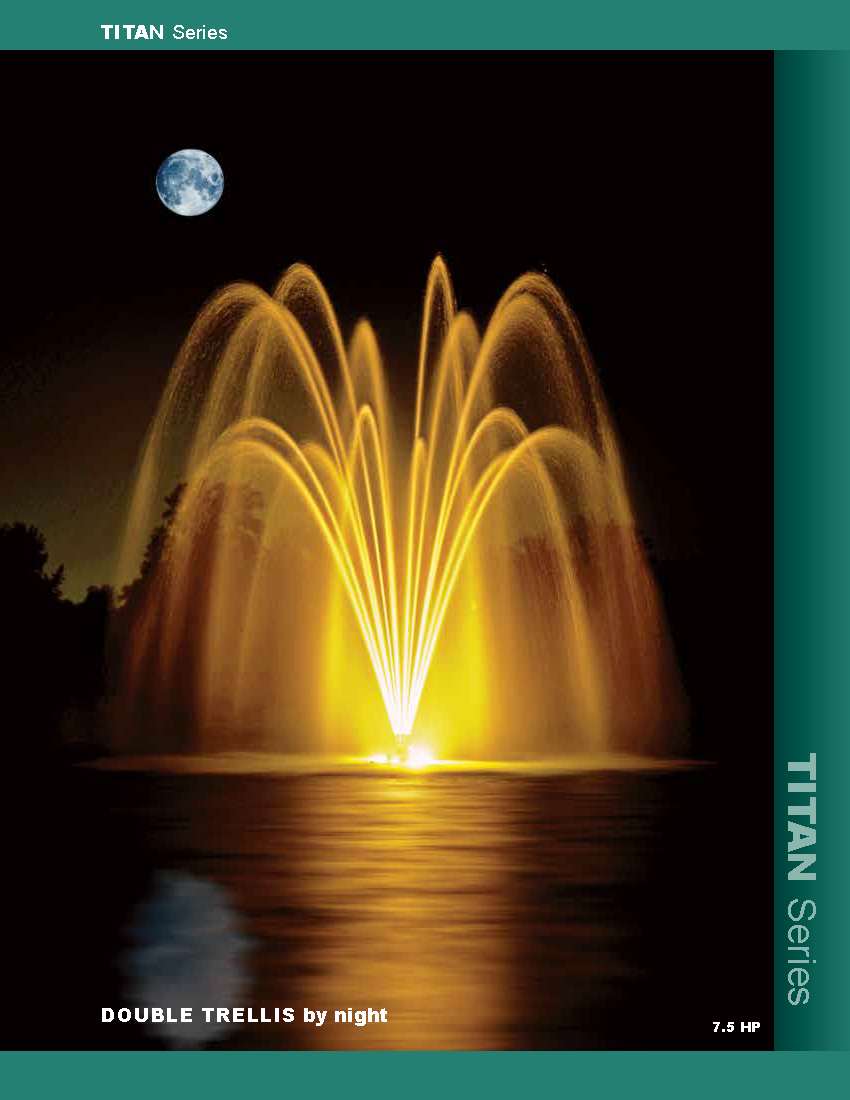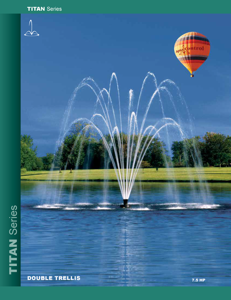 The AquaControl Titan Series 20HP Fountain (ranging from 7.5 HP to 40 HP) is the cornerstone of the Aqua Control floating product offerings. The Titan 7.5HP Fountain features a centrifugal pump (uses an impeller). These pumps are designed to produce high pressure, thus producing tall and wide spray patterns.