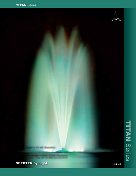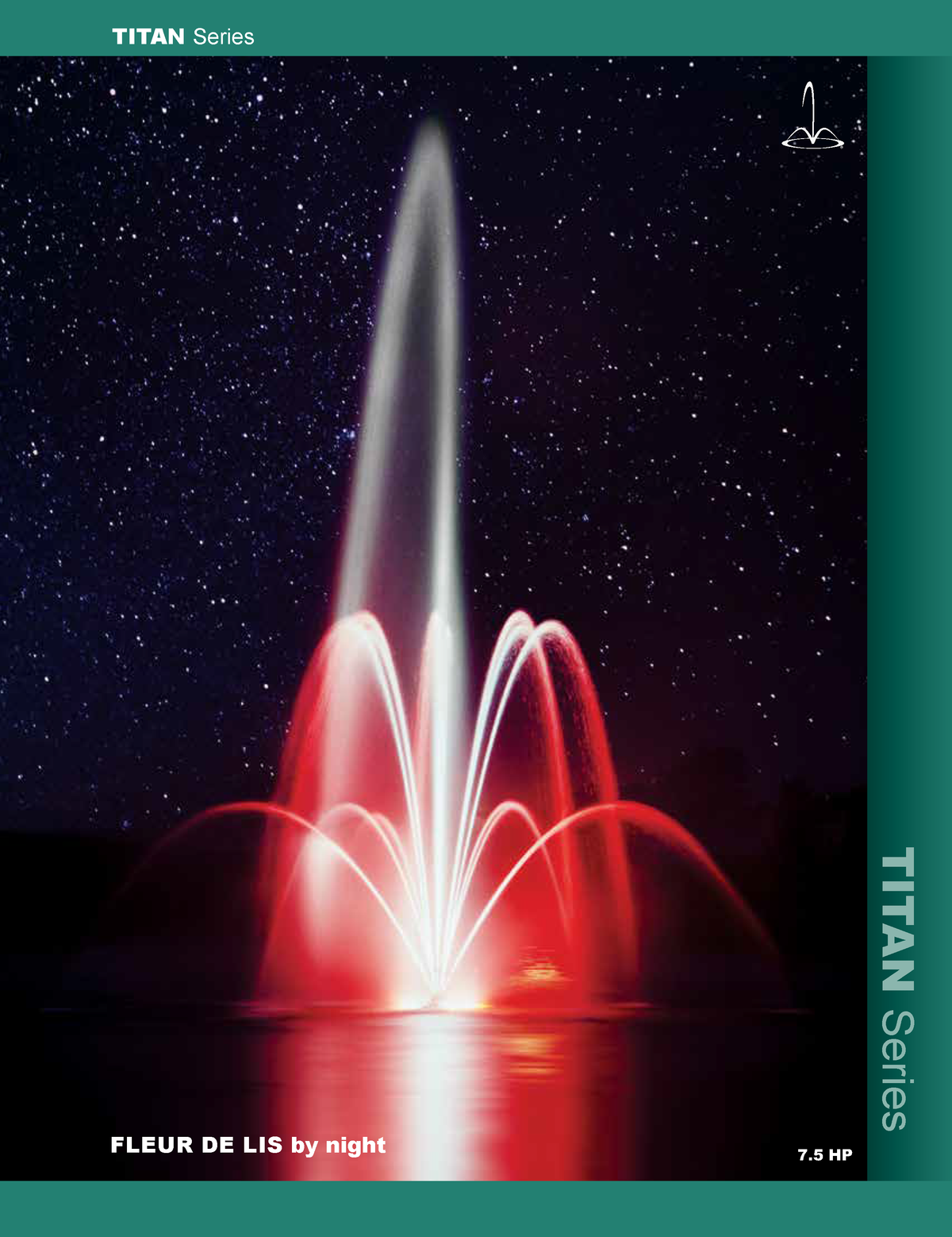 The AquaControl Titan Series 40HP Fountain (ranging from 7.5 HP to 40 HP) is the cornerstone of the Aqua Control floating product offerings. The Titan Fountain features a centrifugal pump (uses an impeller). These pumps are designed to produce high pressure, thus producing tall and wide spray patterns.