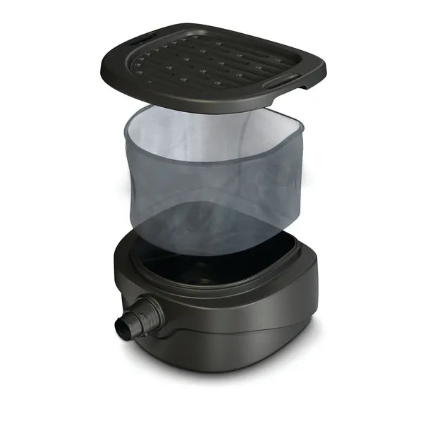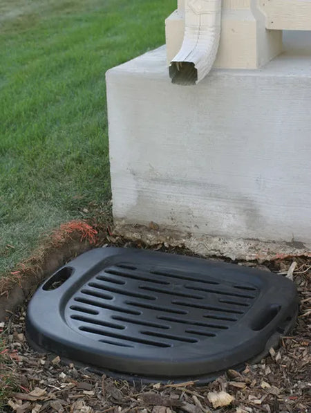 Installed and buried out of sight at the base of the downspout to capture and remove a variety of pollutants and debris that may be flushed out in the system during a heavy rain. Incoming rainwater is passed through a series of mechanical filters that remove leaves, twigs, seeds, and small sediment that accumulate on the surface of the roof between rain events. The first stage of filtration consists of a grated lid and layer of gravel (not included) that remove larger debris. The second stage of filtration is a 300-micron net that effectively removes finer particulate such as sediment composed of roofing material, dust, and other debris. Filtered rainwater then discharges into the rainwater harvesting system. The filter includes a molded hose tail that can accommodate 3″ or 4″ corrugated drain pipe.