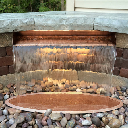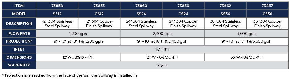 Atlantic 304 Stainless Steel Spillways provide an enticing and durable focal point for fresh water applications in the hardscape. Atlantic's copper finish spillways feature heavy-gauge construction for ageless durability. 304 Stainless Steel Spillways are available in 12", 24" and 36". The CS12 is 12" long. Spillways replace 4-inch wall blocks for easy and convenient installation in standard wall block construction without cutting. Lively, energetic water flow enhances any vertical wall installation. Load bearing body design supports 80 lbs. per linear foot for trouble free installations. Non-clogging weir reduces maintenance in open basin applications.