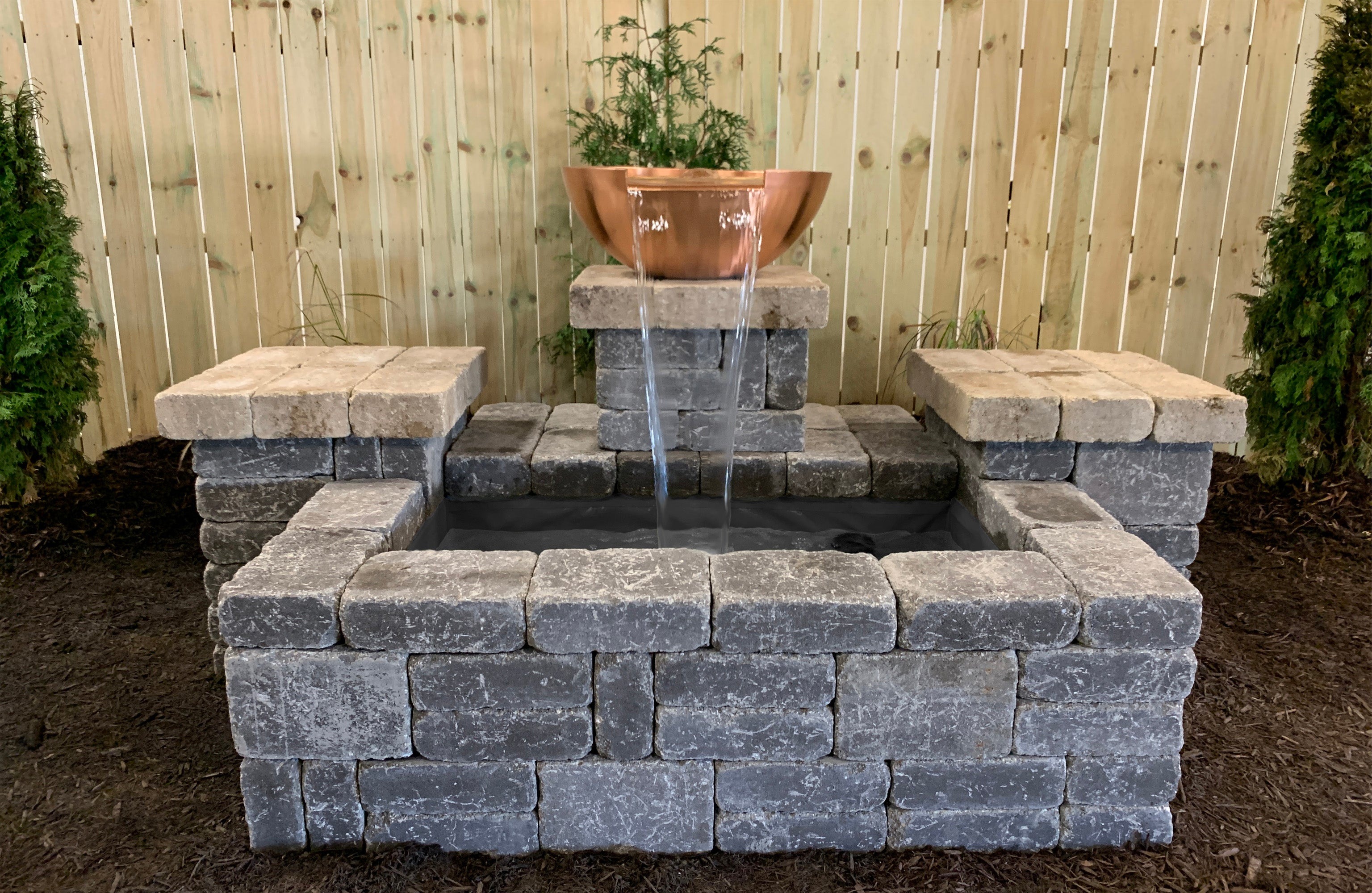 Copper Spillway Bowl Project Bundles include 26" Copper Spillway Bowl, Flexible Hardscape Basin, pump, plumbing and glue