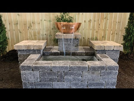 Atlantic's Project Bundles include all the Atlantic components you need, ready to be assembled into the water feature of your dreams. Project Bundles are an assembly of all Atlantic components needed to add a water feature to a new or existing hardscape. Build a beautiful Formal Spillway using your choice of stone. Copper Spillway Bowl Project Bundles include 26" Copper Spillway Bowl, Flexible Hardscape Basin, pump, plumbing and glue. Bundles install directly into 4" x 8" x 12" stone enclosures, but adapt to a variety of engineered stone sizes. Two Copper Bowl styles, round or square, and three Flexible Hardscape Basin colors, black, grey and tan, accommodate various architectural styles. Project Bundle shows Copper Spillway Bowl at 22" above water level, but plumbing will accommodate varying heights. The BNDL CB26S12B includes a 26" Square Copper Spillway Bowl, TT1500 pump and a black Flexible Hardscape Basin.