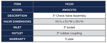 Atlantic's AWGCV30 is an asymmetrical valve body that fits vertical pumps with little lateral clearance. Its rubber coupling simplifies and valve removal or servicing, maintenance and winterizing. It can be extended to any height using 3" Sch40 pipe and fittings. It has a full flow flap that's designed to reduce friction loss and increase flow. The AWGCV30 has valve dimensions of 11.5"L x 5.5"W x 13.5"H with a 3" socket inlet and 3" rubber coupling outlet. It has a 3-year warranty.
