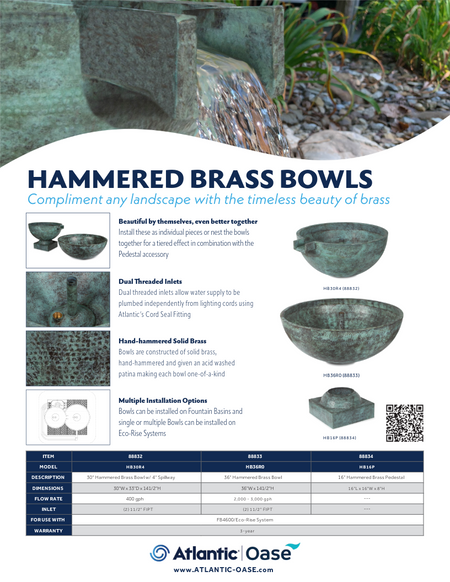 Atlantic’s Hammered Brass Bowls compliment any landscape, hardscape or pools cape with the timeless beauty of brass. Atlantic Hammered Brass Bowls are handcrafted of solid brass in two styles, with a matching pedestal for dual bowl installations. It has an acid wash finish that imparts an attractive, unique patina to the surface making each bowl one - of - a - kind. The solid brass sandpiper create a bubbling fountain effect at the top of both overflowing and spillway styles and supports Atlantic Ring Lights. The dual 1.5” inlets allow the water supply to be plumbed independently from the lighting cords using Atlantic’s Cord Seal Fitting. The HB36R0 has a flow rate from 2,000-3,000 GPH, (2) 1.5” FIPT inlet and has dimensions of 36”W x 14.5”H. It’s best used with the FB4600 and Eco-Rise System. It has a 3-year warranty.