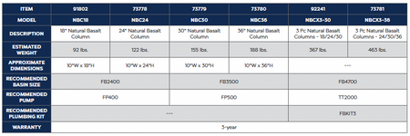 NBC36 is 36" tall and has an estimated weight of 210 lbs. We recommend using the FB3200 Fountain Basin, FBKIT1 Plumbing Kit, and FP500 Fountain Pump.