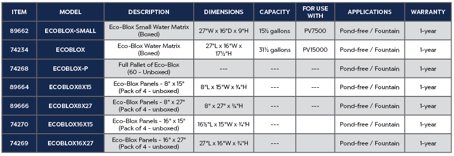 - SMALL Model: ECOBLOX-SMALL Item: 89662 For Use With: #89583 - PV7500. Capacity: 15.5 Gallons. Dimensions: 27"W x 16"D x 9"H