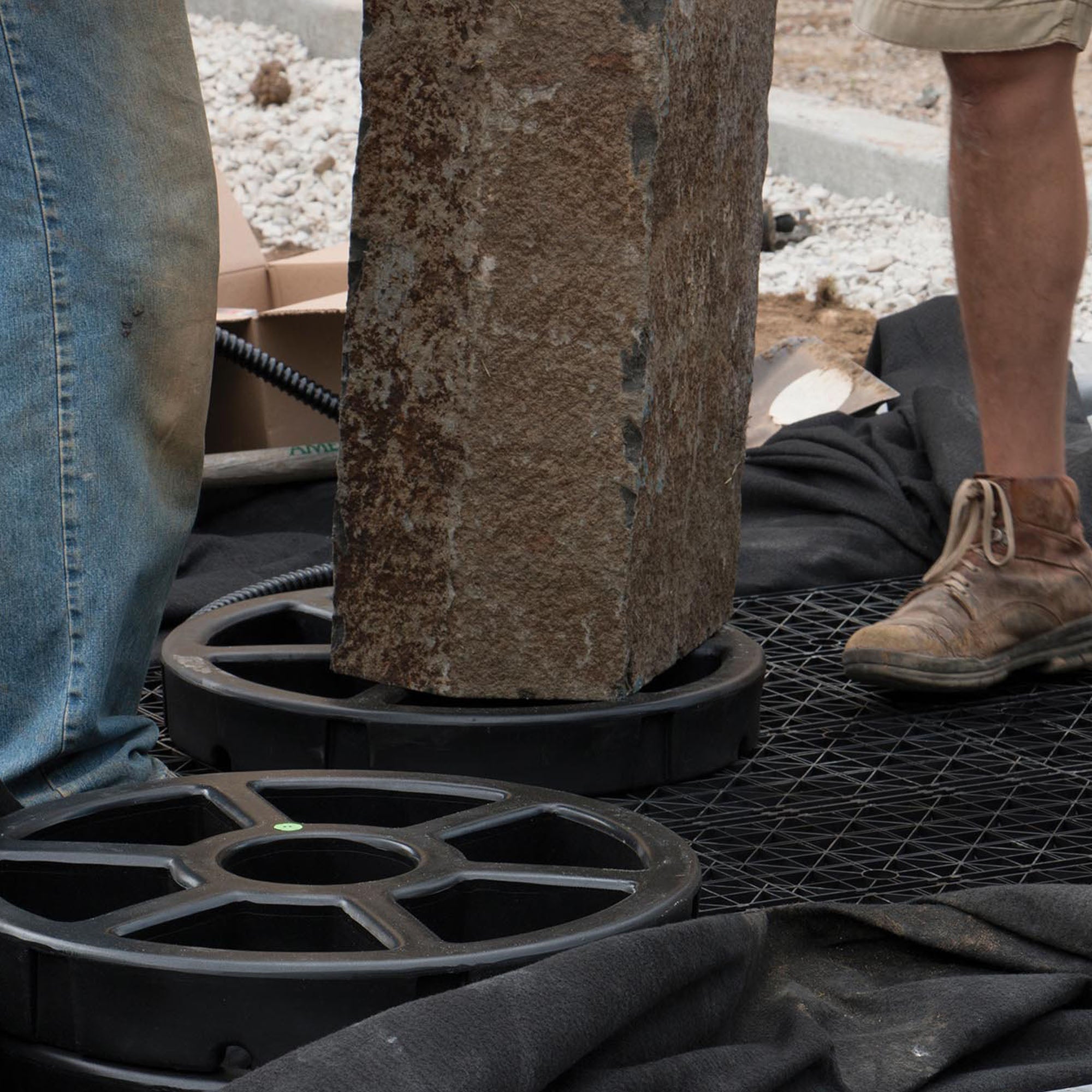 Atlantic’s innovative weight distribution ring with plumbing and lighting ports supports fountain pieces directly on Eco-Blox reservoirs
