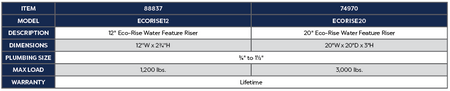 Atlantic’s innovative weight distribution riser raises and supports fountain pieces directly on Eco-Box Reservoirs. Pipe and cord chases provide space for plumbing and light cords to pass under and into decorative pieces without damage. The Eco-Rise System solves weight and splash limitations of traditional molded fountain basins with a weight capacity of 3,000 pounds per Eco-Rise. It has a reinforced radial structure that distributes the weight of statuary, vases and columns over multiple Eco-Box vertical support panels. The ECORISE20 has dimensions of 20”W x 20”D x 3”H and accommodates plumbing sizes of 0.75” to 1.5”. The maximum load for the 20" Eco-Rise is 3,000 lbs. and it has a lifetime warranty.