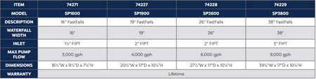 Fastfalls Spillway boxes diffuse incoming water flow to create the starting point of Pond-free streams and falls. Atlantic FastFalls are designed to make plumbing the top of the waterfall as easy as possible. Innovative rear liner attachment simplifies installation and eliminates leakage due to settling. Crush-proof design with internal baffles stabilized by support cones carries the weight of the largest rock and stone. Reinforced spillway lip retains rock, gravel, mulch or soil and can be planted to blend seamlessly into the surrounding landscape. FastFalls includes installation kit, male thread adapter and one-piece liner flange. The PS3800 has a 38" waterfall width and a max flow of 9,000 gph.