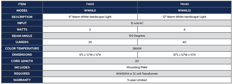 The WWHL12 has a 12 volt AC input with 12”L x 0.875”W x 0.875”H and includes a mounting plate. It requires a WW30X4 or 12 volt Transformer with a 5-year limited warranty.