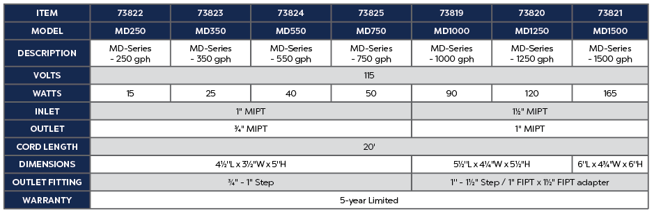 Atlantic’s MD-Series Pumps provide years of service under the demanding conditions of smaller ponds, waterfalls and fountains, with the help of its Magnetic Induction pumps. Atlantic MD-Series pumps feature better flows at high heads, a longer warranty and are easier to service. The male threads on both the inlet and outlet are less restrictive for higher flow. The Volute can be oriented in 4 ways for maximum versatility in placement. A quarter-turn accesses replaceable impeller assembly for easy periodic cleaning to pump running for years. It has a large, stable base for anchoring the pump and may be removed in tight applications. The removable pre-filter and oversized ceramic shaft reduces internal wear and extends its service life. Its included outlet fittings are tapered to fit a wide array of tubing types and sizes. The MD1000 through the MD1500 includes 1.5” adapters for use with the Triton Check Valve and Fountain Plumbing Kits.