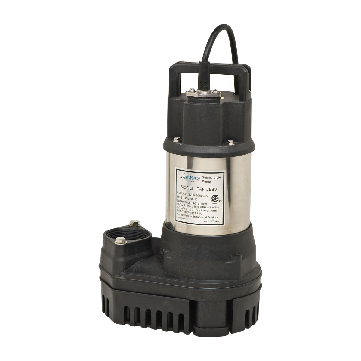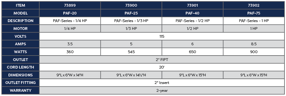 The PAF-25 has a 0.33 HP motor, 115 volts, 5 amps, 545 watts and a 2” FIPT outlet. It has a 20’ power cord and dimensions of 9”L x 6”W x 14.5”H with a 2” insert outlet fitting and a 2-year warranty.