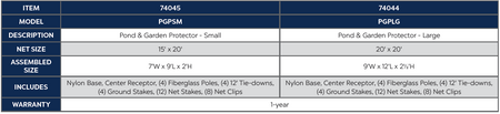 The PGPLG is a 20’ x 20’ net with an assembled size of 9’W x 12’L x 2.5’H. It comes with a 1-year warranty and includes a Nylon Base, a Center Receptor, (4) Fiberglass Poles, (4) 12’ Tie-downs, (4) Ground Stakes, (12) Net Stakes and (8) Net Clips.