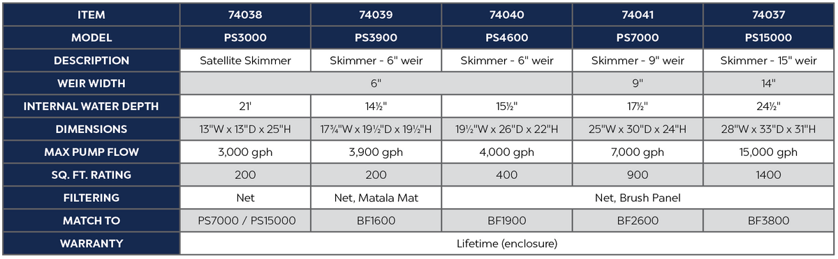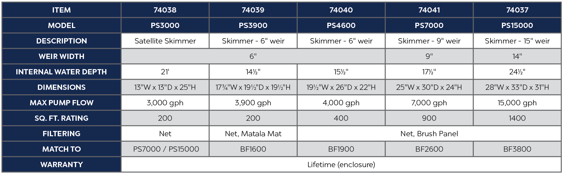 Atlantic Skimmers house and protect your pump and plumbing while clearing surface debris from the pond. Atlantic's Pond Skimmers feature more size and filtration options and greater strength and versatility. All Skimmers excluding the PS3000 accept two pumps for increased flow, lower operating costs and multiple spillway options. Multiple filtration options including net, mats and brushes let you customize to fit every water garden. Reinforced structures eliminate warping, deformation and callbacks. Faceplate hardware is black anodized stainless steel for maximum concealment and longevity. Multiple plumbing, check valve and ionizer options make these Skimmers the most versatile on the market. PS3000 Satellite Skimmer plumbs to a larger Skimmer (PS7000/PS15000) to draw water from hard to reach areas using an AquaMax Eco Premium Pump, installed inside the liner. The PS1500 features a sturdy removable top lid that supports natural rock camouflage and foot traffic. The heavy-duty brush panel provides maximum surface area for mechanical filtration. The heavy-duty stainless steel framed trap net is idea for catching large debris and the rolled upper rim provides clean lines and great strength. The Super Flow weir door maximizes skimming efficiency and the ribbed design enhances structural rigidity and strength. The PS15000 has a weir width of 14”, an internal water depth of 24.5”, a max pump flow of 15,000 GPH and matches to the BF3800. It has net and brush panel filtration and a lifetime (enclosure) warranty.