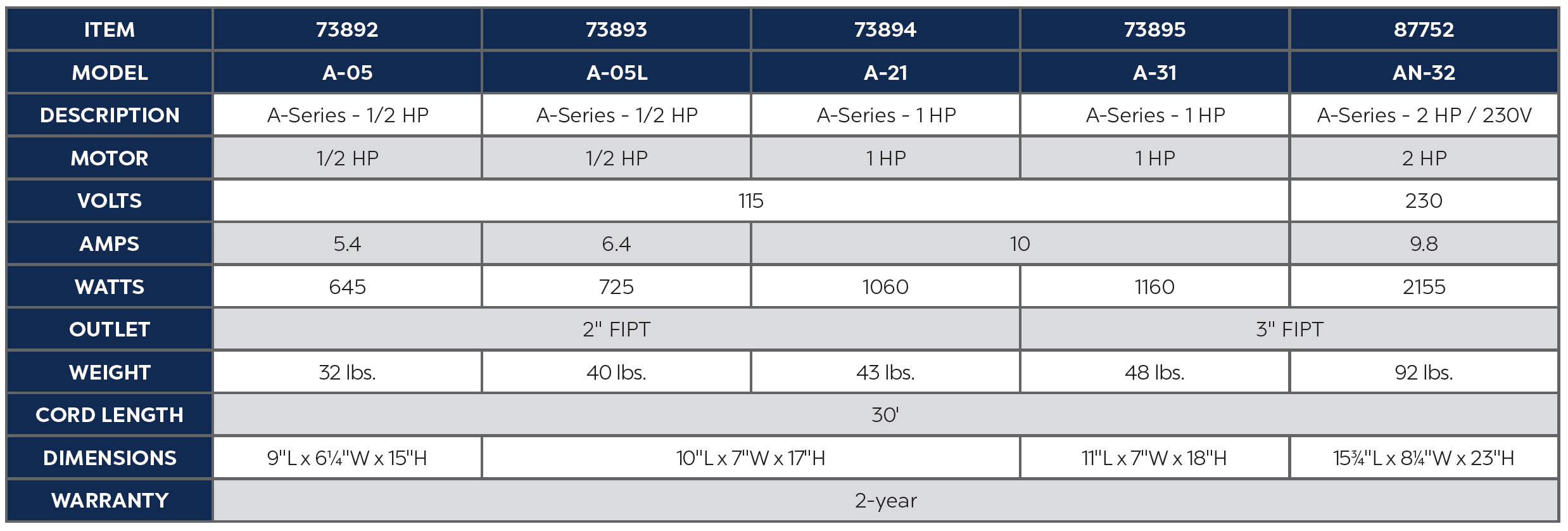 A-Series pumps feature heavy-duty cast iron and stainless steel housing for years of dependable service