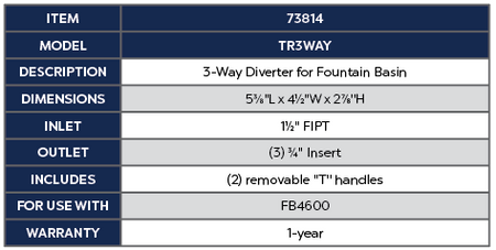 The Triton 3-Way Diverter works with the FB4600 Fountain Basin to provide individual flow control to multiple fountain pieces without having to access the pump inside the pump chamber. The Triton 3-Way Diverter features an 1.5" inlet that allows unrestricted flow into the manifold and ball valves with removable handles that enable independent flow adjustment of each outlet. The compact design makes it a perfect fit for installation in Pump Vaults and Fountain Basins.