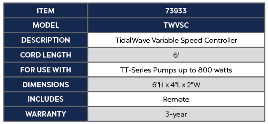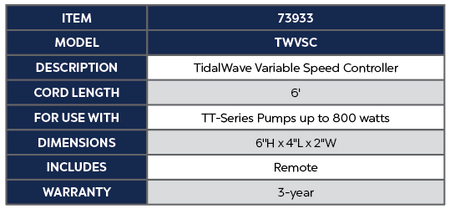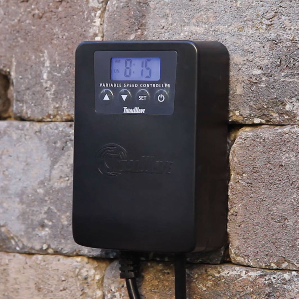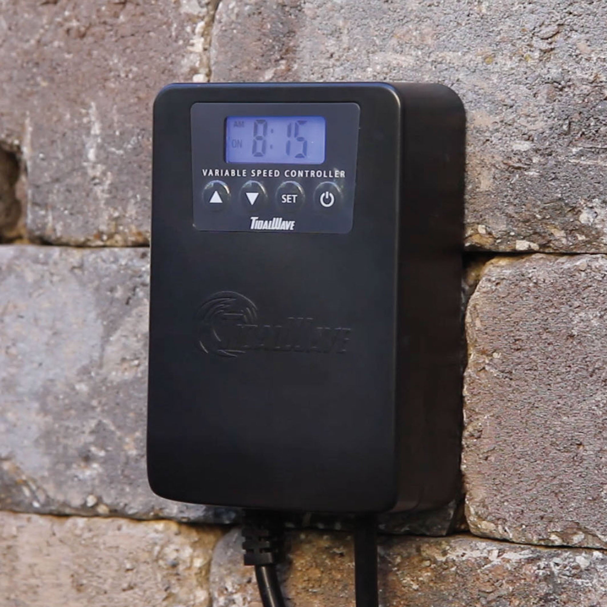 Atlantic's TidalWave VSC allows you to vary the output of TidalWave TT-Series Asynchronous pumps wirelessly by remote control or mobile app. The VSC allows you to set both on and off times as well as adjust pump from max flow down to 25% in 10 levels of adjustment, giving you the ultimate control over water flow. Unlike integrated variable speed controllers, where any failure of pump or controller renders everything non-operational, our Variable Speed Controller operates separately from the pump. The LCD Screen on the control panel displays time of day and flow levels, and accesses programmable on/off timer. The VSC will retain the flow level and programmed on/off times even in the event of a power loss. Cord lock function eliminates inadvertent plug disconnection. Rugged weatherproof housing allows you to mount the control box outdoor near your pump. Great for routine maintenance and feeding fish. Download our new TidalWave VSC app on the App Store and Google Play to wirelessly control your Variable Speed Controller from your smartphone or tablet. All TidalWave Variable Speed Controllers are compatible with the TidalWave VSC app. The VSC app allows you to adjust the flow and power on/off your VSC. Customize your network name and password for secure access. Effortlessly switch between multiple VSCs in Wi-Fi settings to control different water features. Available for both Android and Apple smartphones and tablets. The TWVSC has a 6' power cord and is best used with TT Pumps up to 800 watts. It has dimensions of 6"H x 4"L x 2"W and includes a 2.4GHz Remote Control and has a 3-year warranty.