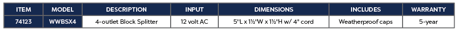 Atlantic’s quick-connect wiring makes connecting multiple fixtures fast and easy. The compact inline 4-out Block Splitters for Warm White simplify connections and mount on flat surfaces to neaten and organize wiring. All Splitters feature removable weatherproof caps for unused outlets and include dielectric grease. The Warm White Splitter can be stripped and spliced into existing low voltage systems. The WWBSX4 has a 12 volt AC input with dimensions of 5”L x 1.5”W x 1.5”H and a 4” cord. It includes weatherproof caps and has a 5-year warranty.