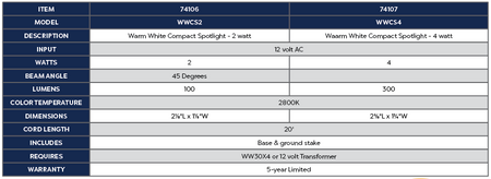 The WWCS4 has a 12 volt AC input with a 45˚ beam angle and dimensions of 2.625”L x 1.75”W. It includes a base and a ground stake. It requires a WW30X4 or 12 volt Transformer and has a 5-year limited warranty.