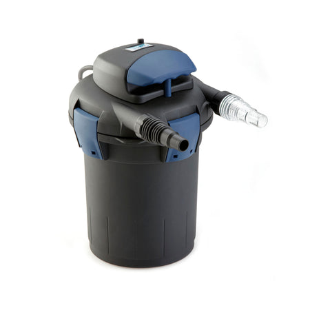 OASE’s BioPress in-line pressure filter offers biological and mechanical filtration that can be located remotely. The OASE BioPress filters use mechanical, biological filtration and ultraviolet light to keep water features up to 1,000 gallons clear. Simply pull the integrated cleaning handle up and down to clean and backflush the filter foams without removing the cover. The quick release clamps make opening and closing the filter when preforming maintenance tasks, easy. The canister may be buried up to the clamps, make sure to use the OASE FiltoCap to completely conceal the filter. You can easily monitor the UVC, filter performance and pollutant level without opening filter. It’s best used with pumps with a 17' shut off or less and waterfalls up to 7' higher than the filter. The BioPress qualifies for the OASE Clear Water Guarantee when paired with the proper pump. It includes 2 types of filter foams, a 1.25 “- 1.5” Sch 40 adapter, UVC, metric step fittings and 10' power cord.