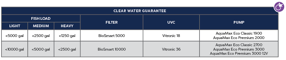 The BioSmart 10000 has a light fish load of less than 10,000 gallons, a medium fish load of less than 5,000 gallons and a heavy fish load of less than 2,500 gallons. It’s compatible with the Vitronic 36 UVC and both AquaMax Eco Premium 3000 and AquaMax Eco Classic 2700.