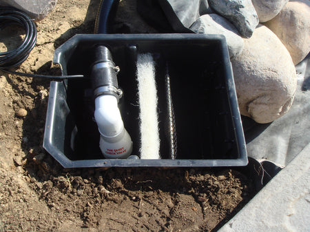 The DIY Pond Skimmer 90 is installed at the edge of your pond with the snout opening at water level. The pond pump is placed inside the skimmer and draws water into the skimmer opening, mechanically filtering out leaves, twigs, and other floating debris. The debris is trapped inside a net and filter pad within the skimmer, preventing it from reaching your pump and clogging your filtration system. This first line of defense dramatically reduces maintenance time and extends pump life by keeping debris out of the pump intake. Simply remove and clean the debris net and filter pad periodically to maintain optimal performance.