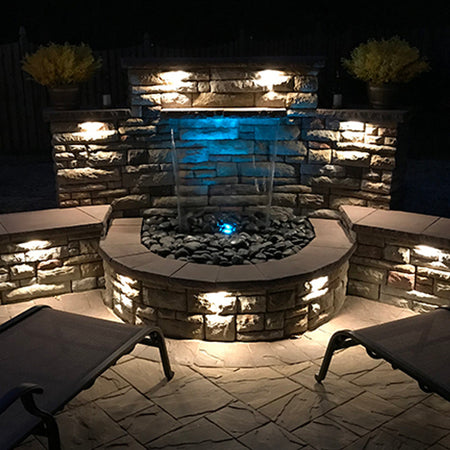 The Basin Kit for Large Formal Falls was designed to create an easy way to install a pondless waterfall feature within a block wall structure indoors or outside with a maximum height of 24". The basin can be sunk in-ground or used above ground and comes equipped with dual pump access through an access panel located just under the splash mat. Additionally, if you are looking to install an autofill to maintain the water level, a pre-installed spinweld located on both the left and right makes installation fast and easy. Included in this kit are 2 LED color Lights with Remote.