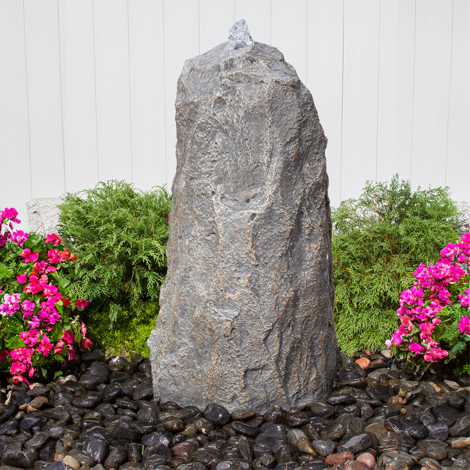 Each complete kit includes everything needed for professional installation. The molded basin is buried at ground level and filled with water. The pre-drilled natural stone pyramid sits on top of the basin (supported by the basin cover or grate). The Mag-Drive pump sits inside the basin and pumps water up through tubing that runs through the center of the stone. Water bubbles out the top and cascades down the sides back into the basin. The flow control valve allows you to adjust water speed to achieve your desired visual and auditory effect. Polished pebbles conceal the basin edge and create a finished, professional appearance.