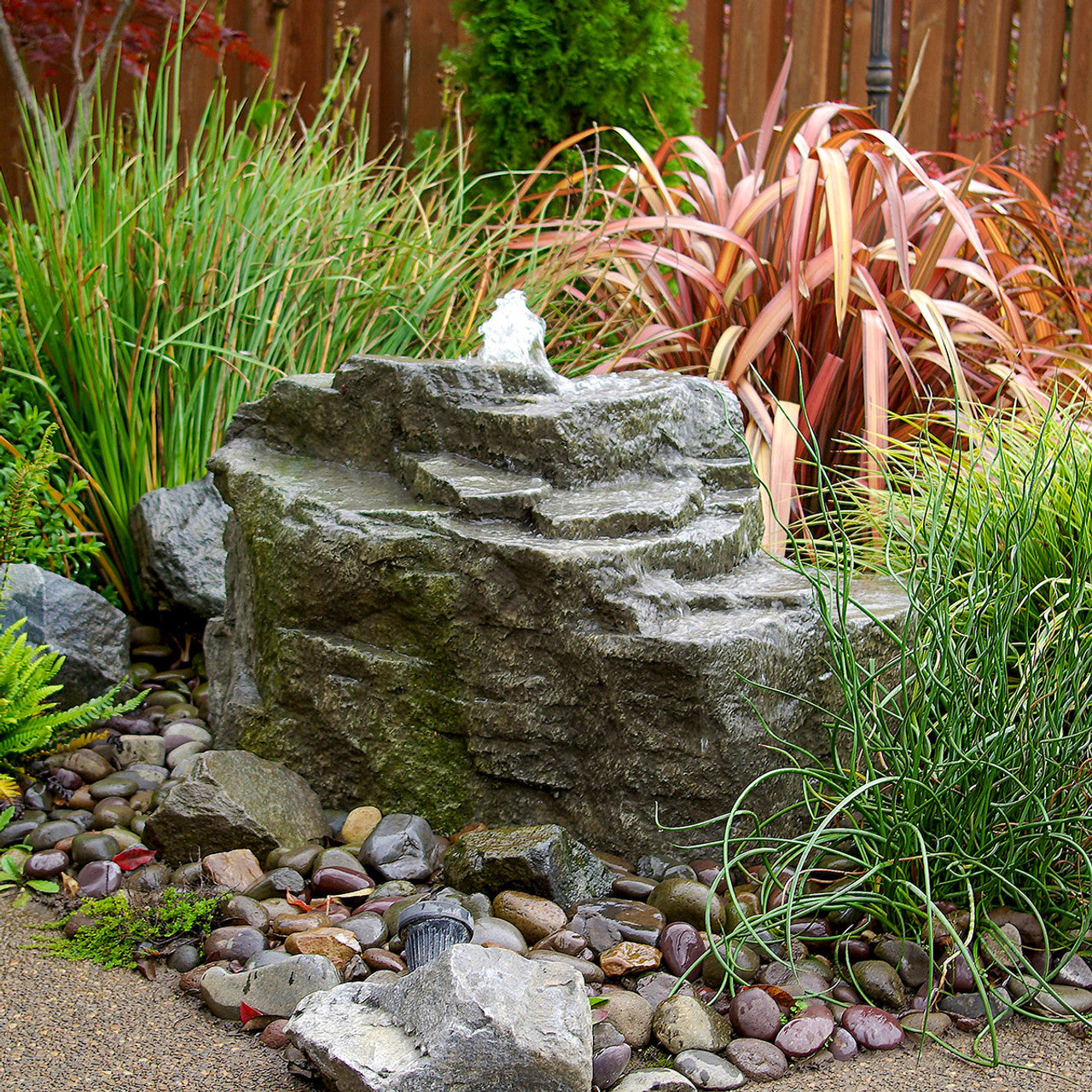 Layered for a gentle waterfall effect, this is one of our most popular Bubbling Boulders. This fountain blends well in any garden landscape.