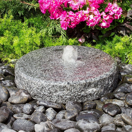 Kit includes: medium molded fountain basin, 530 gph Mag-Drive pump, flow control valve, plumbing, tubing, & 120 lb Black Polished Pebbles