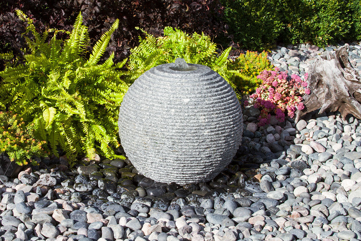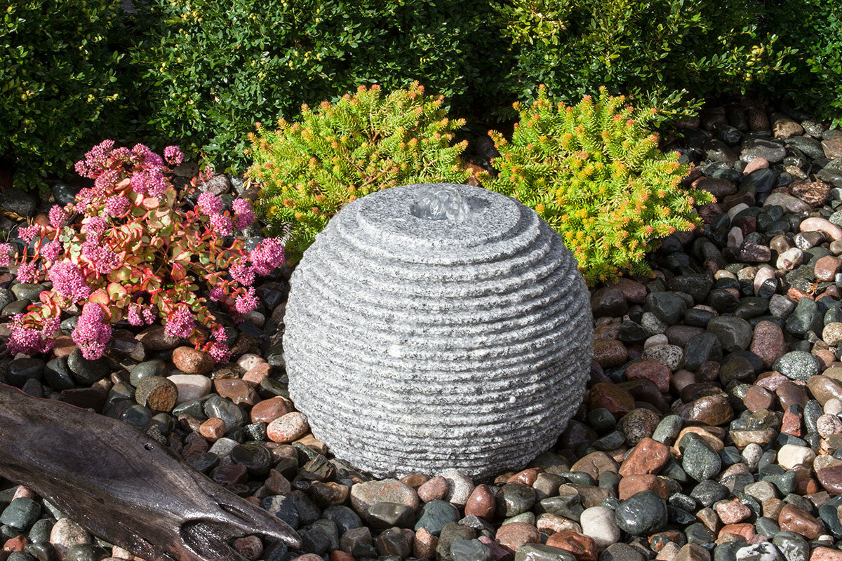 The Blue Thumb Ribbed Sphere Granite Fountain Kit transforms natural stone into a captivating water sculpture. Water flows gracefully over the irregular saw-cut ribbed texture, creating a mesmerizing wavy pattern that catches light and movement throughout the day. Each sphere is precision-crafted from premium granite, delivering both visual impact and enduring durability.