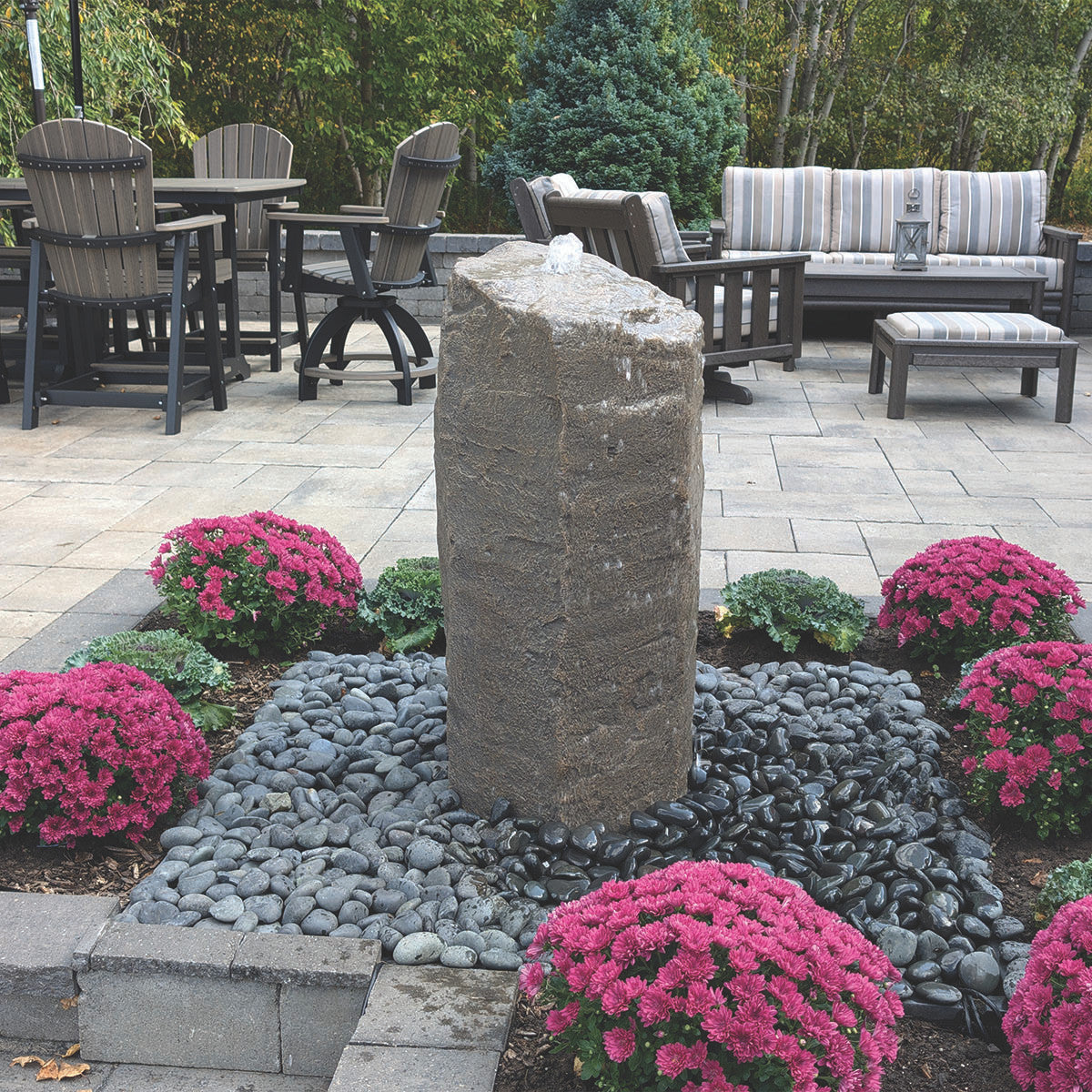 A: The fountain itself is 22" x 23", but you'll need space for the 49" square basin. Plan for approximately a 5' x 5' area for the complete installation including surrounding decorative pebbles.