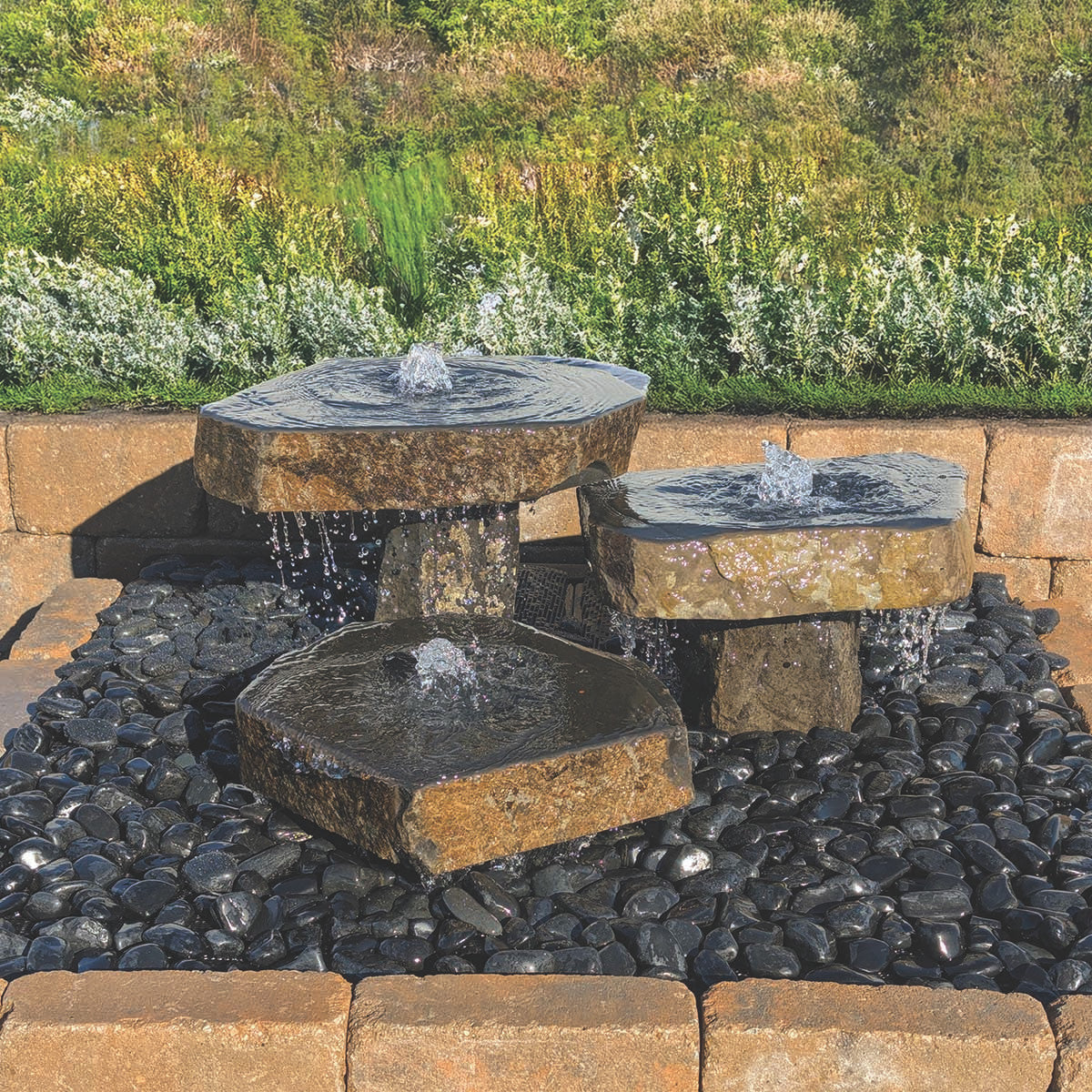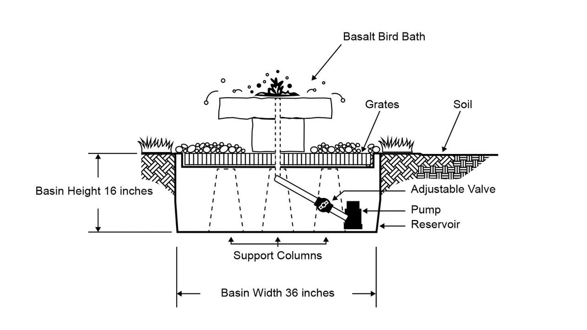 - Complete Fountain System: Includes three basalt columns, basin with grate and screen, pump, and all plumbing