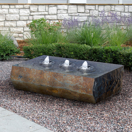 The large-format Ichise Zenshu Series Fountain Kit makes a definitive statement wherever placed. This low-profile fountain has three drilled plumes that cascade over a stately basalt block.
