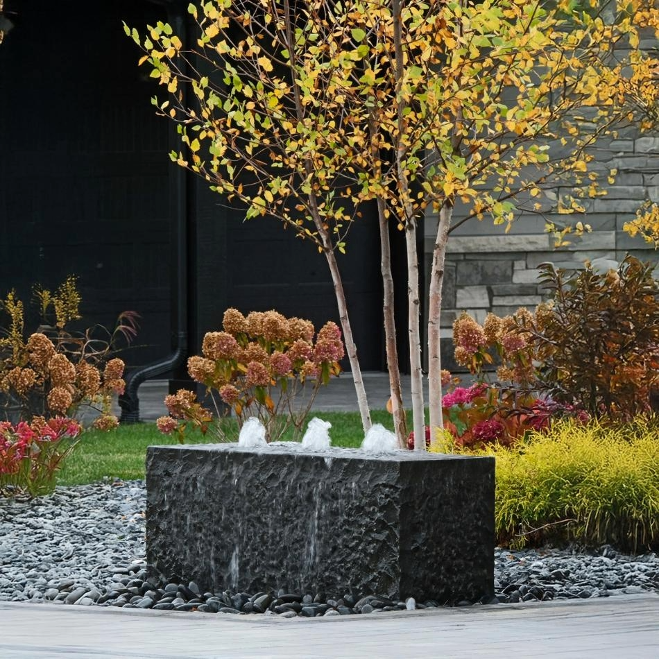 Featuring a Zenshu Series Fountain Kit that makes a statement wherever placed. Each large Triple Drilled Yasuyuki Fountain has three plumes that cascade over a stately rough cut basalt block.
