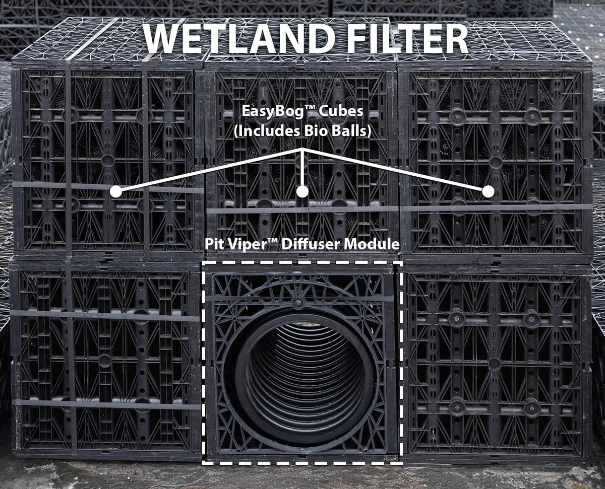 With our modular Pit Viper® Diffuser Modules, EasyBog™ Cubes and Res-Cubes you can create a high-performance wetland filter with exceptional filtration while saving time and money in installation, labor and materials. This means no trenching, less liner, faster install and much less gravel!