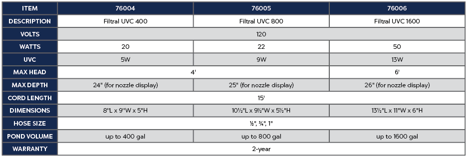 The Filtral UVC 800 has a 9W UVC, a maximum head of 4’ and a 15’ power cord. It has dimensions of 10.5”L x 9.5”W x 5.5’H, a pond volume of up to 800 gallons and a 2-year warranty.