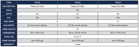 The Filtral UVC 400 has a 5W UVC, a maximum head of 4’ and a 15’ power cord. It has dimensions of 8”L x 9”W x 5’H, a pond volume of up to 400 gallons and a 2-year warranty. The Filtral UVC 400 has a light fish load of less than 400 gallons and a medium fish load of less than 200 gallons.