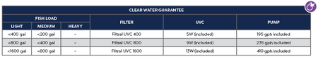 The Filtral UVC 1600 has a max head of 6' and is perfect for ponds up to 1,600 gallons. The Filtral UVC qualifies for the OASE Clear Water Guarantee. The nozzle patterns for the Filtral UVC are the Lava, Vulkan and Magma. The Filtral UVC 1600 has a light fish load of less than 800 gallons and a medium fish load of less than 400 gallons.