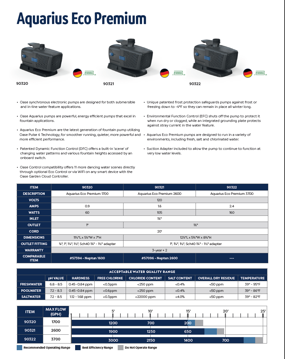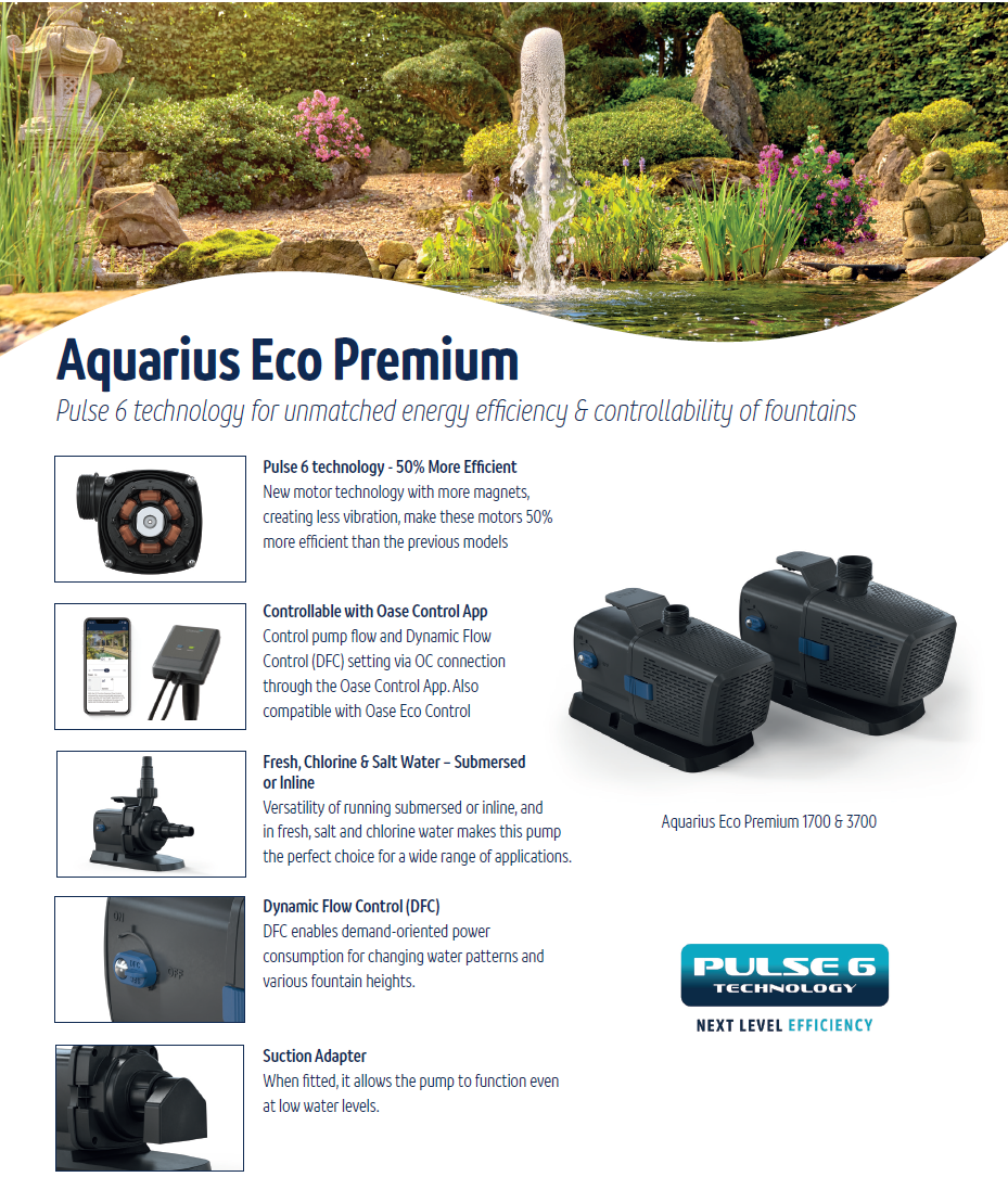 Aquarius Eco Premium are the latest generation of fountain pump utilizing Oase Pulse 6 Technology, for smoother running, quieter, more powerful and more efficient performance.