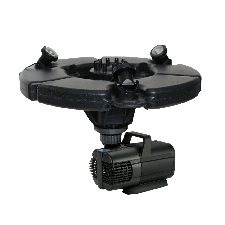 OASE’s Floating Fountains offer an economical shallow water aeration, combined with an attractive visual display. The Floating Fountain with Lights are compact, reliable and energy efficient and they come complete and ready to connect right out of the box! They are designed for use in smaller water features with a minimum depth of 30”, with dimensions for the 1/4 HP at 14.5”W x 19”H. The 3 LED spotlight illumination set brings the various water patterns to life after dark via optional photocell. With 3 ornamental nozzle attachments to choose from; Trumpet, Single Tier and 3-Tier, you’ll be amazed both day and night! The Trumpet Nozzle has a max size of 15.75'W x 3.6'H and is adjustable. The Single Tier Nozzle is 16'W x 10'H. The 3-Tier Nozzle is 6.5'W x 10'H. The grounding plate eliminates any chance of a stray current entering the water for unparalleled safety. The Floating Fountains coated magnetic rotors are impervious to adverse water conditions. The self-cooling, debris flushing rotor chambers help keep the pumps from overheating in the most demanding applications. With a tool-less volute removal, it makes maintenance fast and easy! The Floating Fountain with Lights includes a pump, float body, mooring lines, pump shield, stainless steel mooring anchors, lights and 3 nozzles.