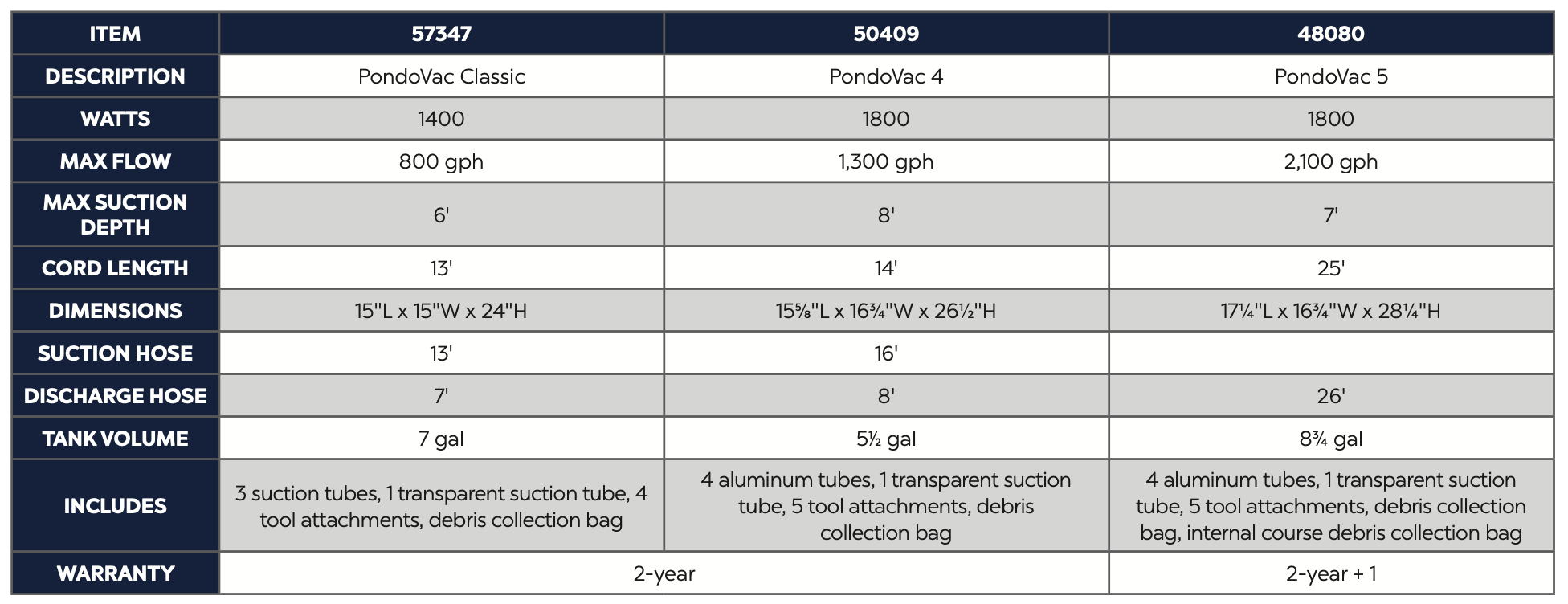 - Suction hose: 13 feet