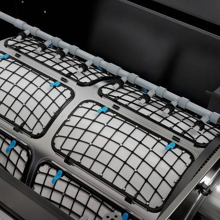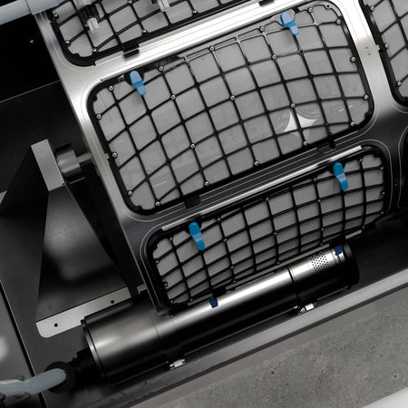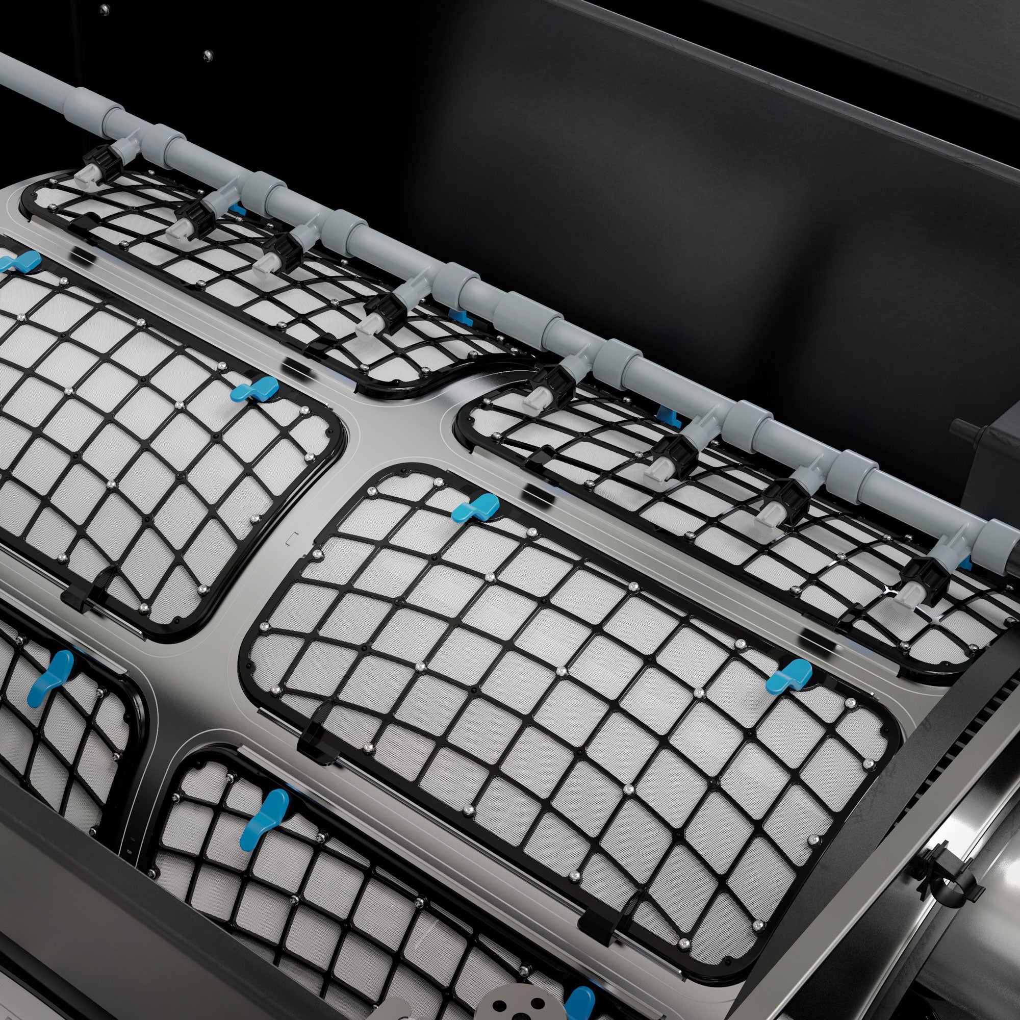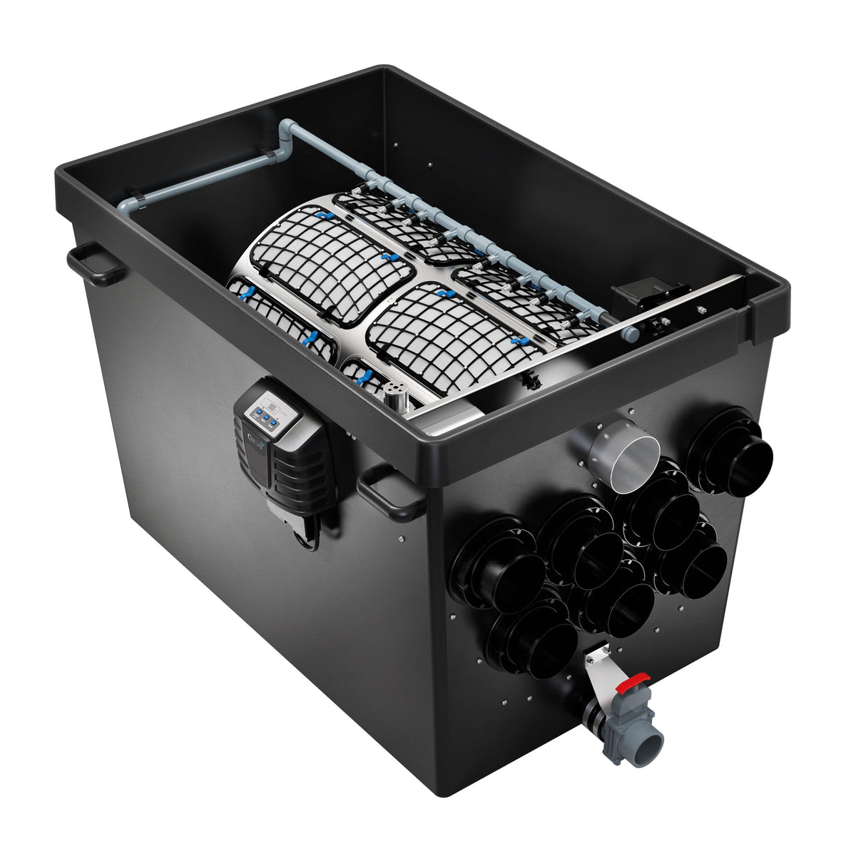 The Drum Filter Module sieves and separates solids in incoming pond water down to 60 microns, automatically cleaning itself with a high pressure pump, via sensor or time interval, or manually