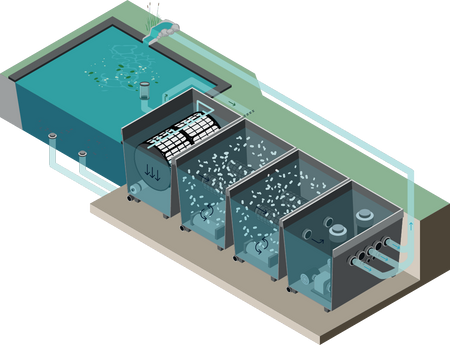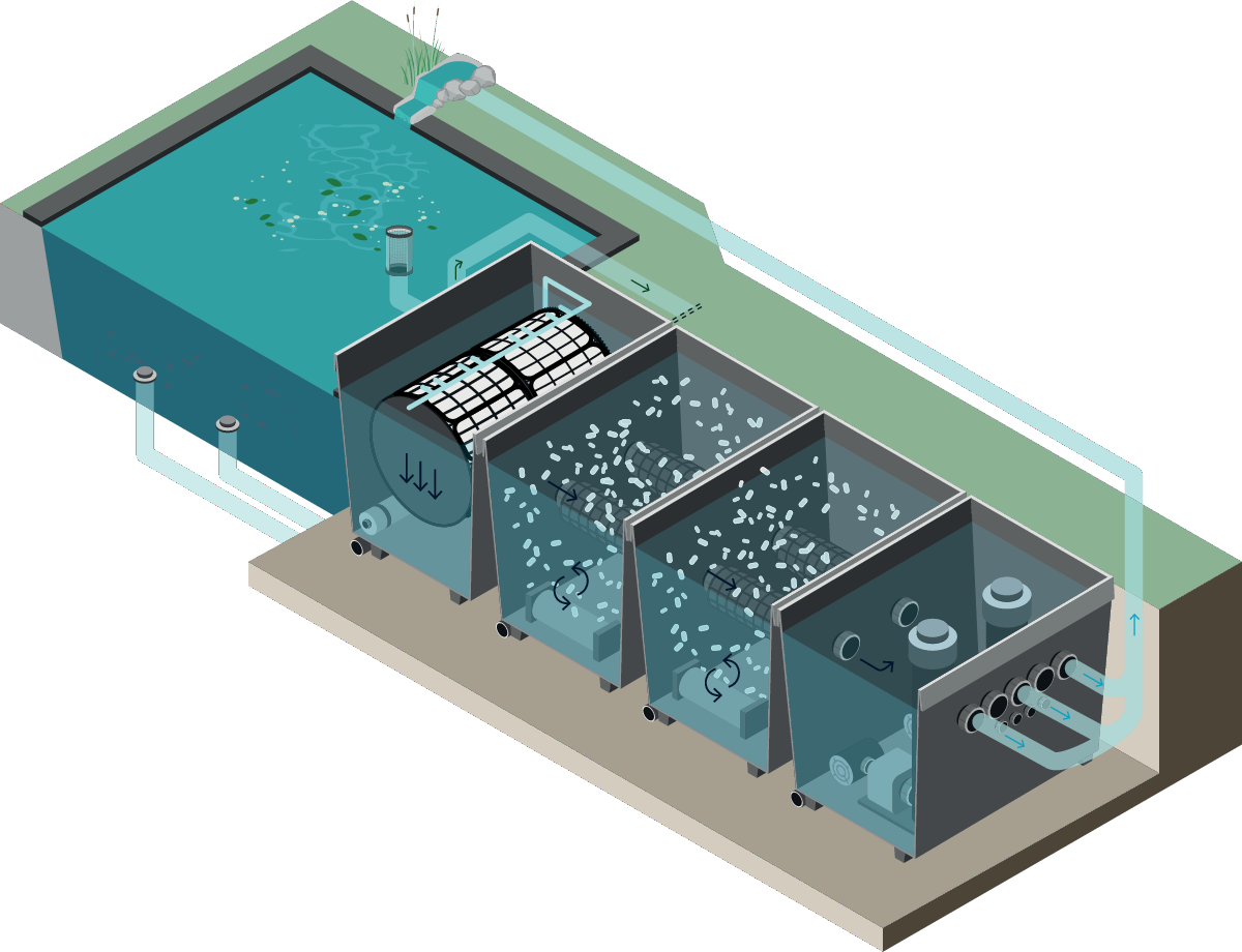 Gravity-fed filters install below pond level, taking in dirty water at one end as clean, filtered water is pumped back to the pond from a pump housed in the discharge side