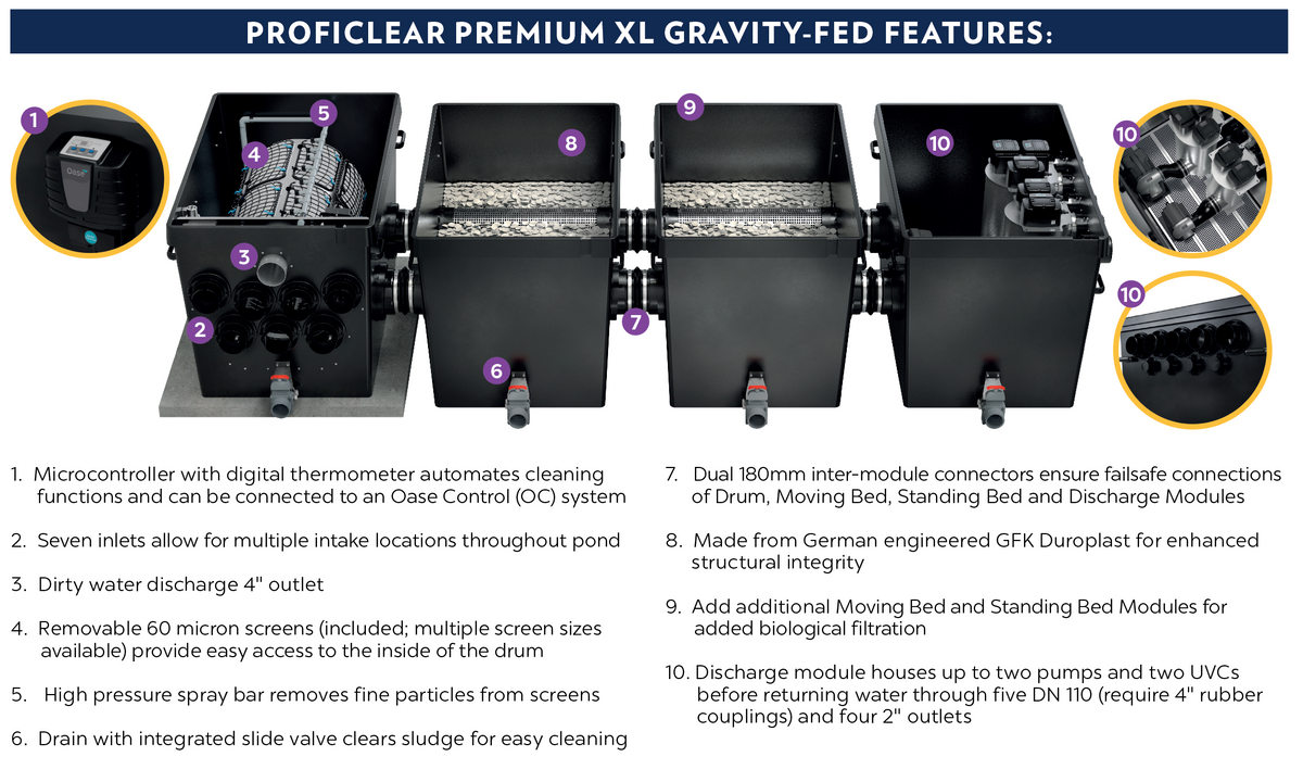 Oase ProfiClear Premium XL filter systems are fully automatic, flow-through, self-cleaning modular filters that polish the water of koi and swim ponds